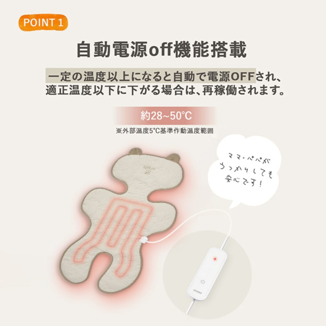 そして、風を送るだけのエアラブ3と違い暖かくなるエアラブウォーム2は、消し忘れたらどうしよう…!熱くなりすぎないかな…!?と心配になるところですが、一定温度以上になると自動で電源がオフされる『自動電源オフ機能』が付いています。