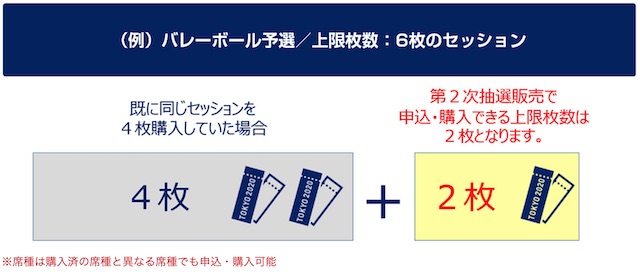 - セッション毎の申し込み上限枚数は2〜6枚(セッションにより異なる。1次抽選購入枚数との累計。)